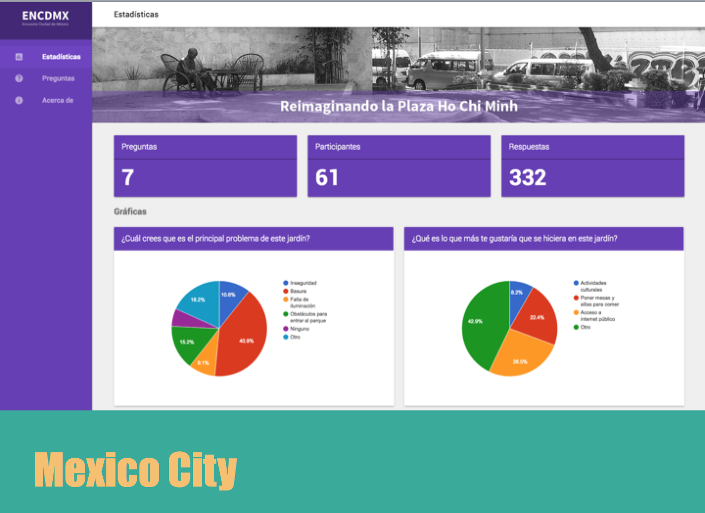 12. Mexico City has over 21 million people live in the city – the most populous in the Western Hemisphere. Public spaces are critical. The MIT media centre created a programme around Libertad de los Pueblos also known as Ho Chi Minh Plaza. Public engagement on issues and solutions was critical to the programme and smart use of digital and non-digital solutions allowed the MIT team to create open public dashboards. BTW – trash and activities for children were the top citizen concerns.