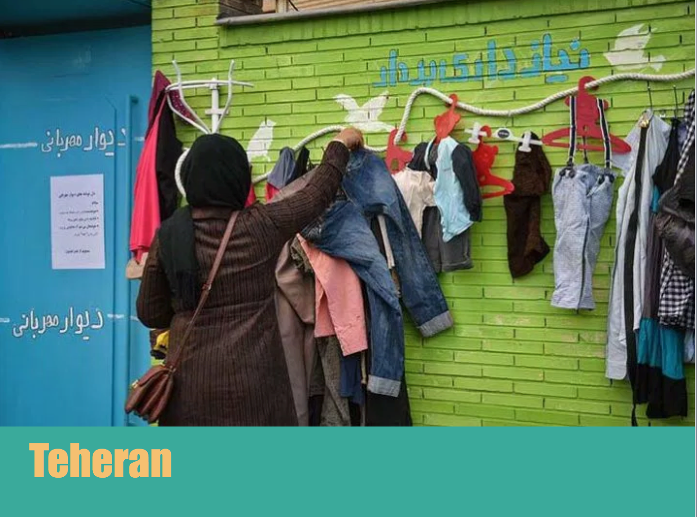 15. In the city of Mashhad, in Northeast Iran, citizens collaboratively developed a “wall of kindness.” It was colourfully painted, with a few hooks and hangers installed. Above this wall, a slogan reads: “If you don’t need it, leave it. If you need it, take it.” Soon after the first wall was built, people began to leave coats, shoes and other warm clothing. The idea spread rapidly on social media, and soon on other city walls. Similar kindness walls popped up in other Iranian cities, such as: Isfahan, Kerman, Tabriz, Bandar Abbas, Shiraz and Teheran.